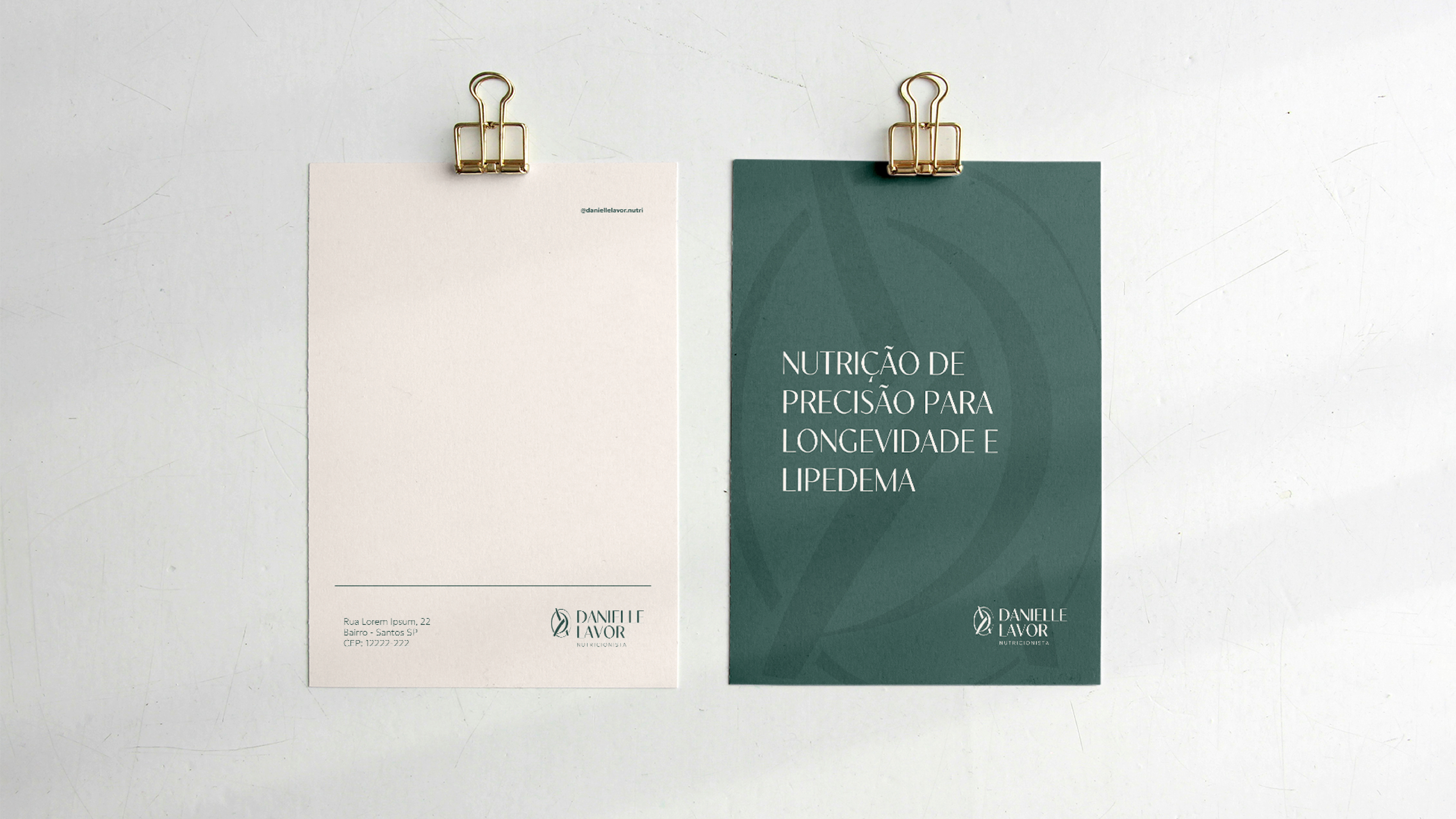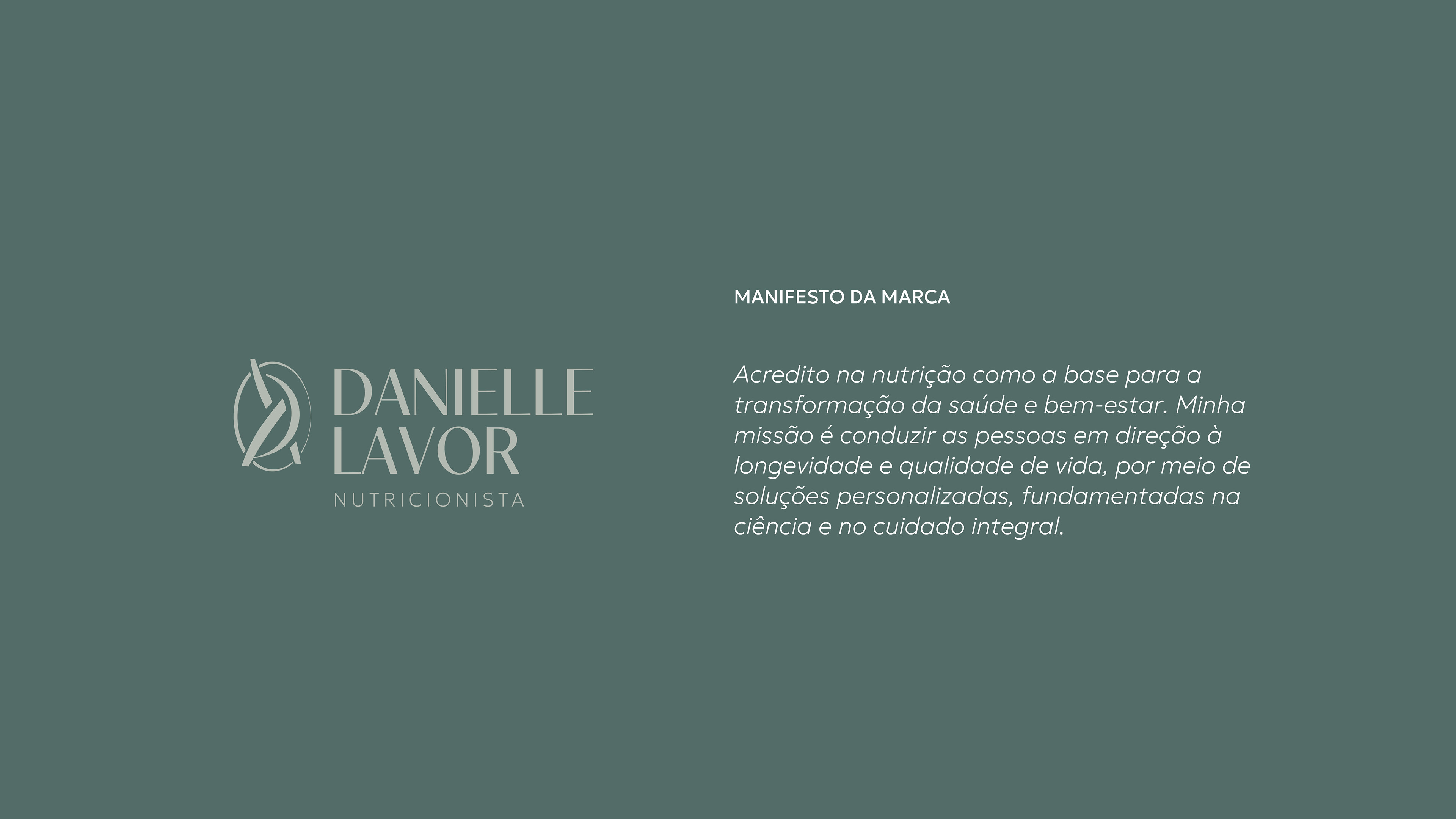 Ao desenvolver a identidade visual da Danielle Lavor, consideramos que a marca deve destacar empatia, cuidado e eficiência. Ela tem como objetivo ser reconhecida como uma nutricionista de confiança, que combina conhecimento científico com uma abordagem humanizada e acolhedora. Com ênfase em nutrição funcional e de precisão e abordagens que consideram a epigenética. A comunicação deve refletir a ideia de uma