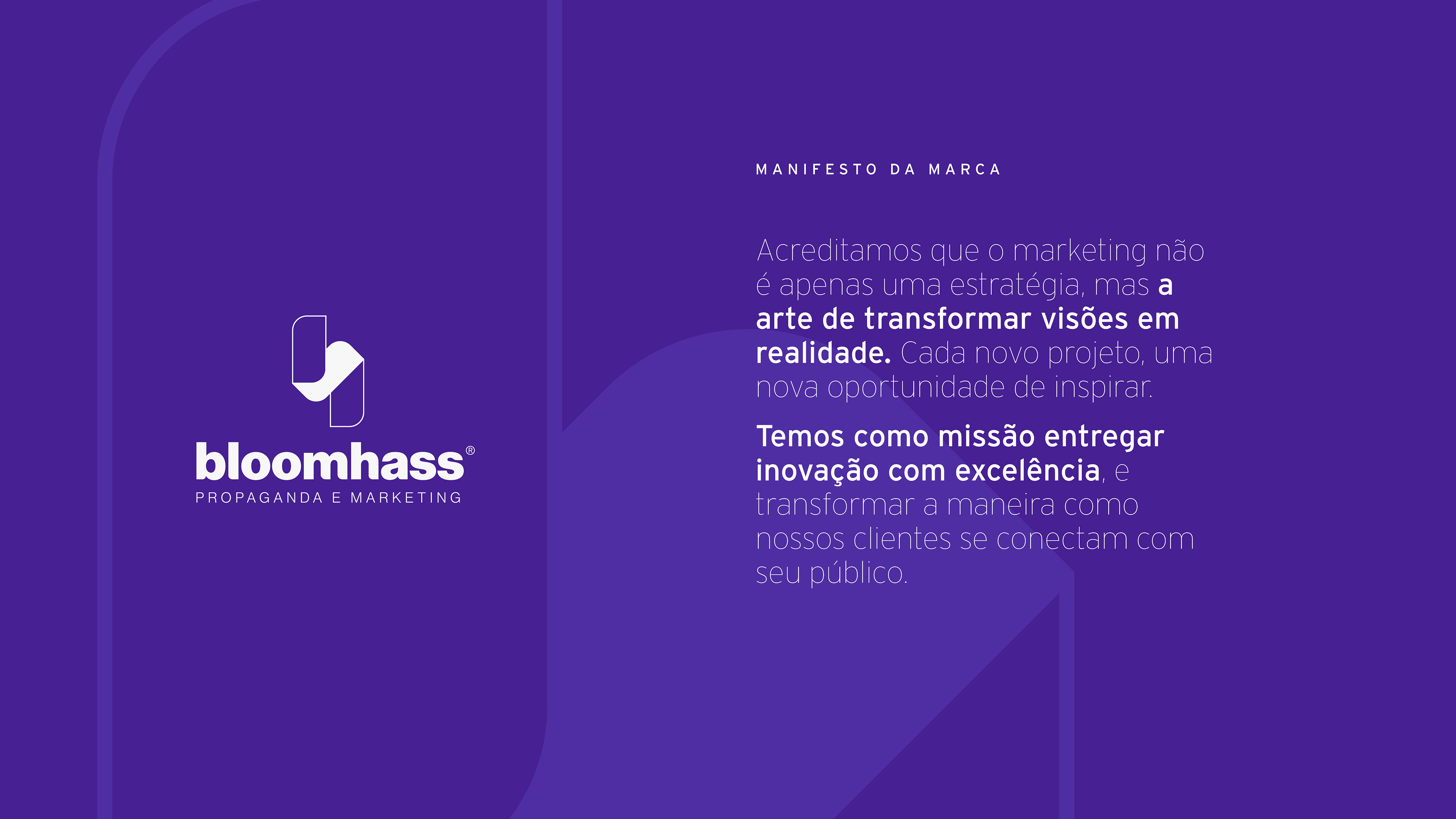 Ao desenvolver a identidade visual da Bloomhass - propaganda e marketing, consideramos que a marca é vibrante e inspiradora, transmite inovação, garra e profissionalismo.